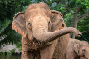 Jokia, whose name means “Eye from Heaven”, was born in 1960. She was rescued in 1999 from illegal logging and extreme abuse. While pulling a log uphill, Jokia suffered a miscarriage but was not allowed to stop to check whether her calf was dead or alive. This event caused her immense physical and emotional trauma, and she fell into a deep depression, refusing to work. In response, her owner cruelly shot her with a slingshot, permanently blinding her in both eyes. One day, Lek heard Jokia trumpeting angrily in the jungle where she was being forced to work, and so began the negotiations for her rescue.